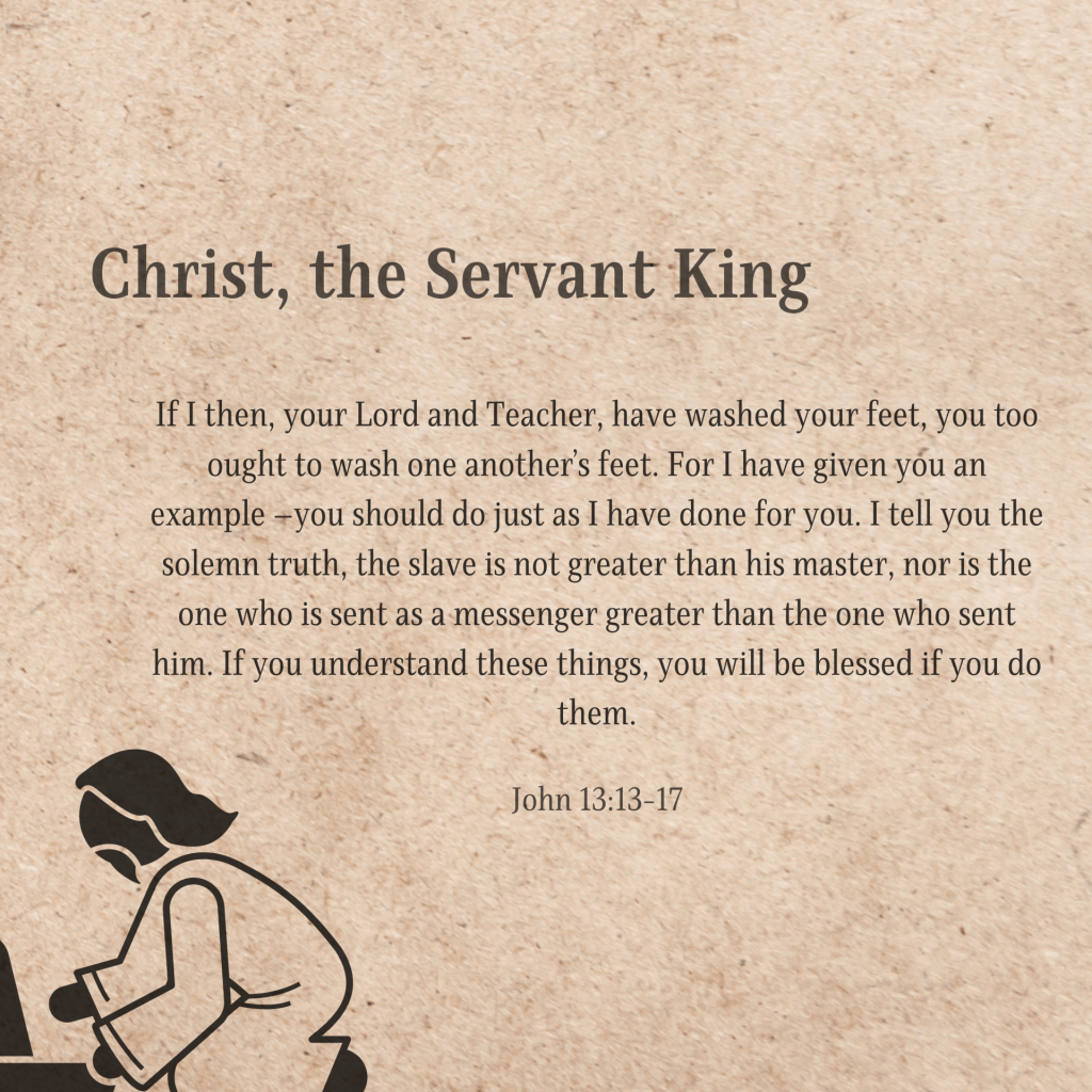 So when Jesus had washed their feet and put his outer clothing back on, he took his place at the table again and said to them, “Do you understand what I have done for you? You call me ‘Teacher’ and ‘Lord,’ and do so correctly, for that is what I am. If I then, your Lord and Teacher, have washed your feet, you too ought to wash one another’s feet. For I have given you an example —you should do just as I have done for you. I tell you the solemn truth, the slave is not greater than his master, nor is the one who is sent as a messenger greater than the one who sent him. If you understand these things, you will be blessed if you do them. – John 13:13-17