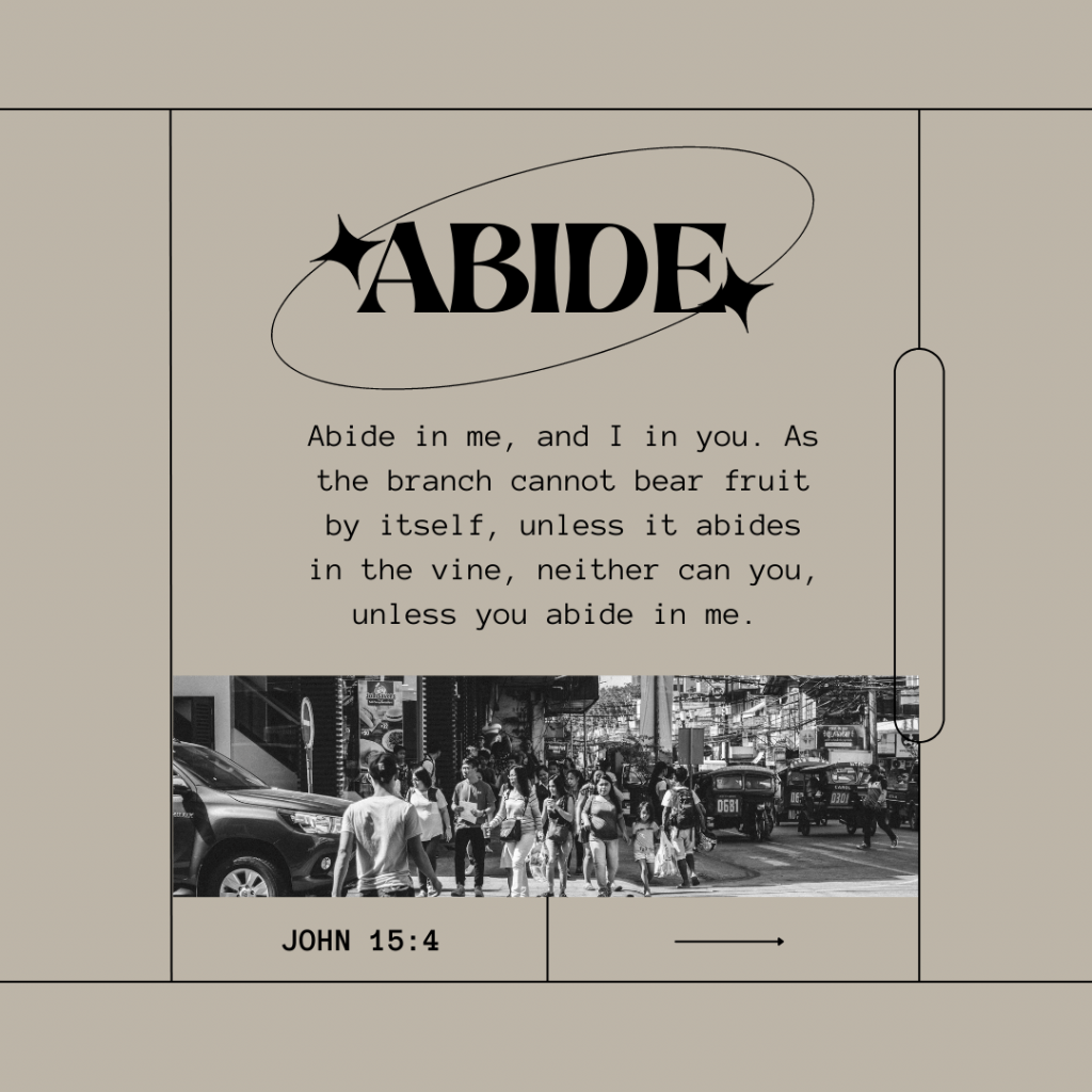 “Abide in me, and I in you. As the branch cannot bear fruit by itself, unless it abides in the vine, neither can you, unless you abide in me.” John 15:4 ESV