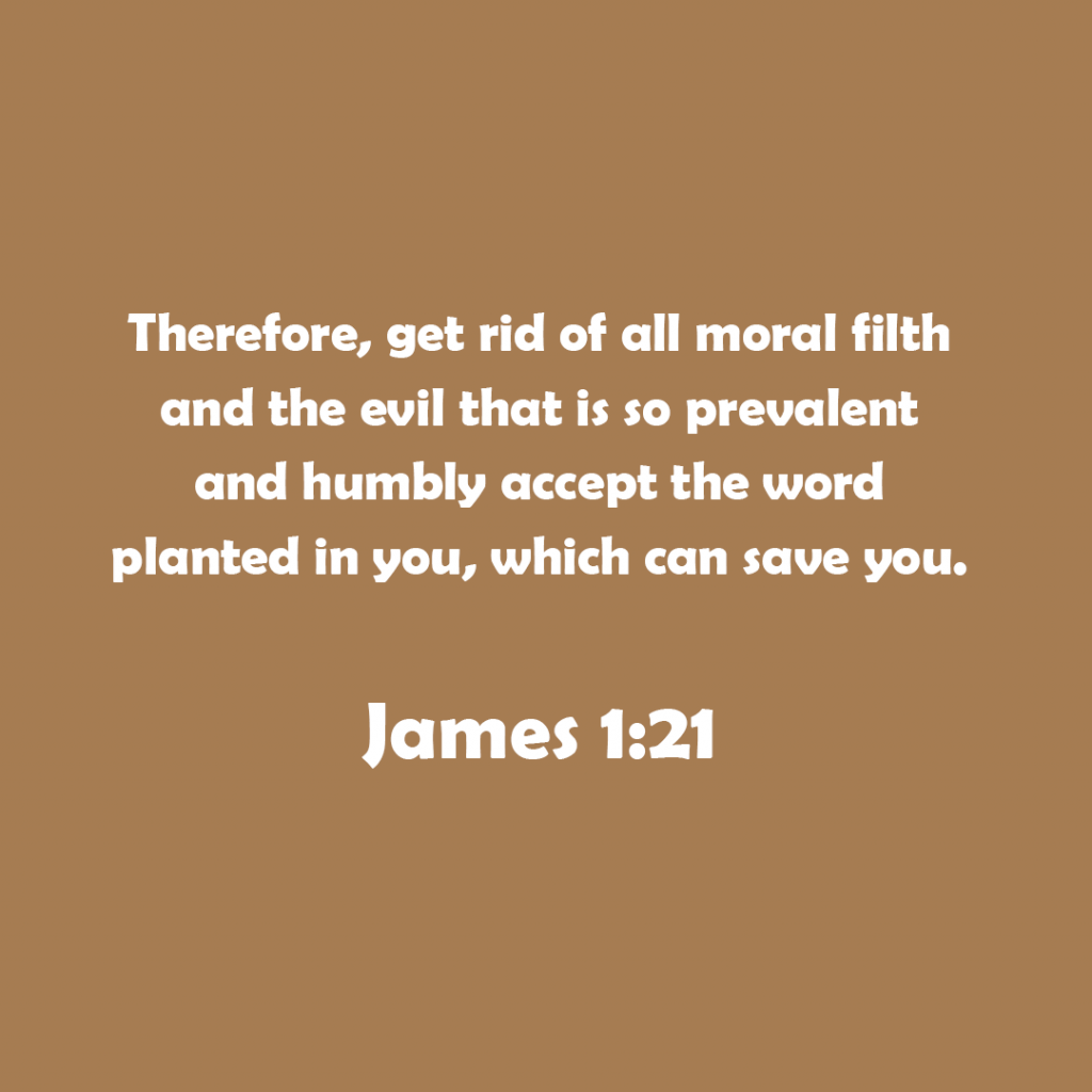 “Therefore, get rid of all moral filth and the evil that is so prevalent and humbly accept the word planted in you, which can save you.” – James 1:21