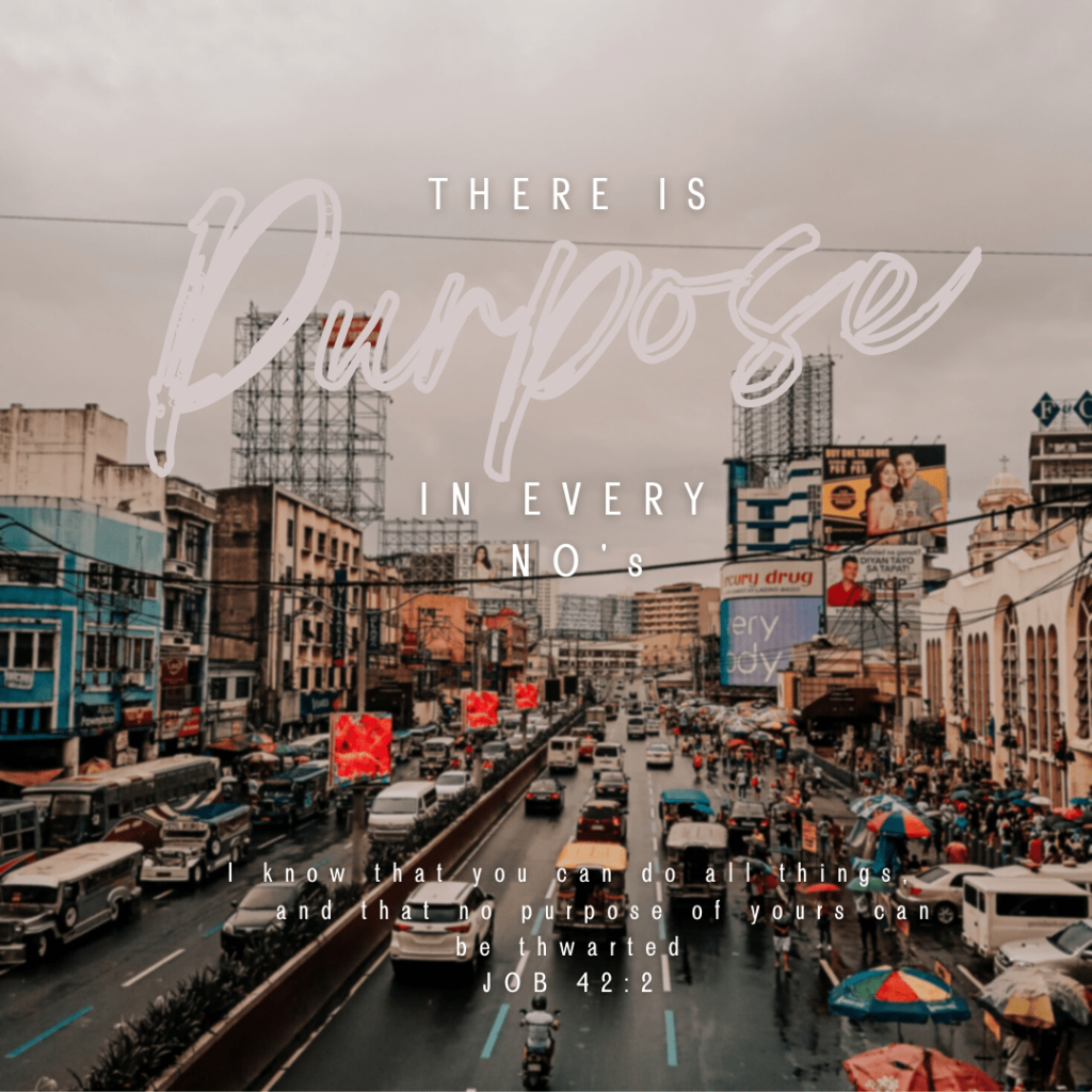 Who wouldn’t be hurt by disappointments, who wouldn’t be discouraged in down moments, who wouldn’t be in despair in suffering, all of these emotions are our natural response to the no’s we received. But relating to Job, we learn that every “no” is a way to a better path, that these detours may serve as God’s protection from us, at times, the no’s can draw near closer to us to know His love and that He can make all things turn out differently for our benefit and most of all, for His purposes.
