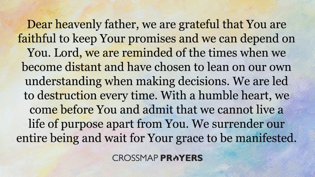 Our Father in heaven, we praise Your great wonders and faithfulness! We are grateful that You are faithful to keep Your promises and we can depend on You. Lord, we are reminded of the times when we become distant and have chosen to lean on our own understanding when making decisions. We are led to destruction every time. And so, with a humble heart, we come before You and admit that we cannot live a life of purpose apart from You. We surrender our entire being and wait for Your grace to be manifested. In Jesus’ name, Amen.