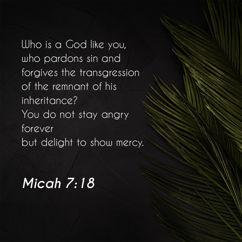 “Who is a God like you, who pardons sin and forgives the transgression of the remnant of his inheritance? You do not stay angry forever but delight to show mercy.” – Micah 7:18