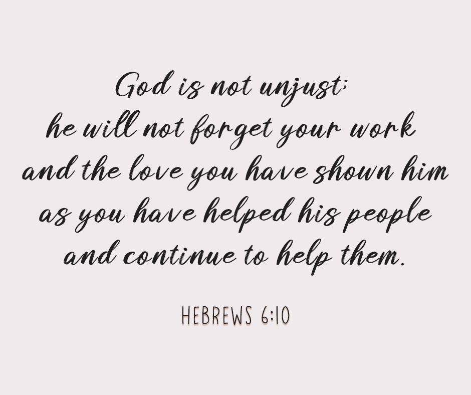 “God is not unjust; he will not forget your work and the love you have shown him as you have helped his people and continue to help them.” – Hebrews 6:10