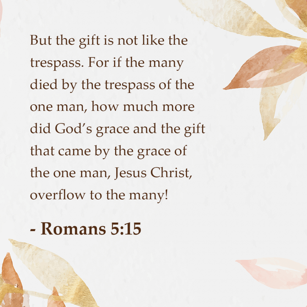 “But the gift is not like the trespass. For if the many died by the trespass of the one man, how much more did God’s grace and the gift that came by the grace of the one man, Jesus Christ, overflow to the many!” – Romans 5:15