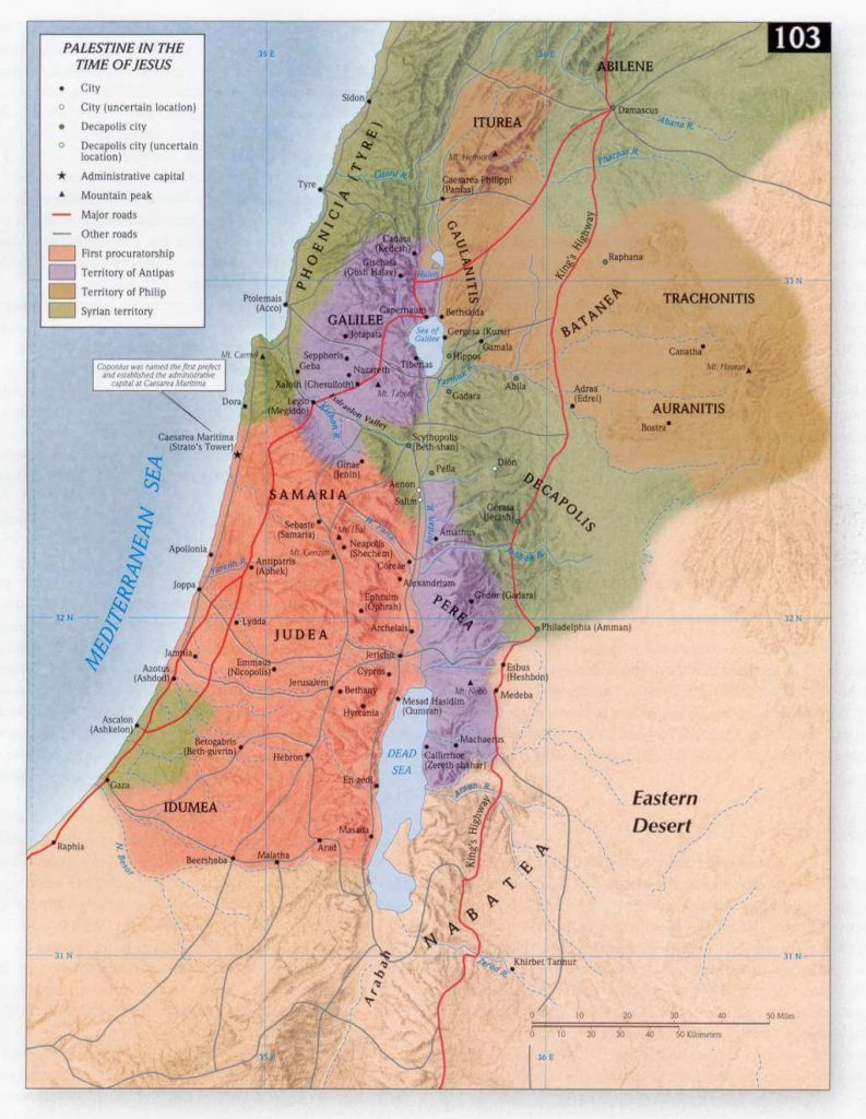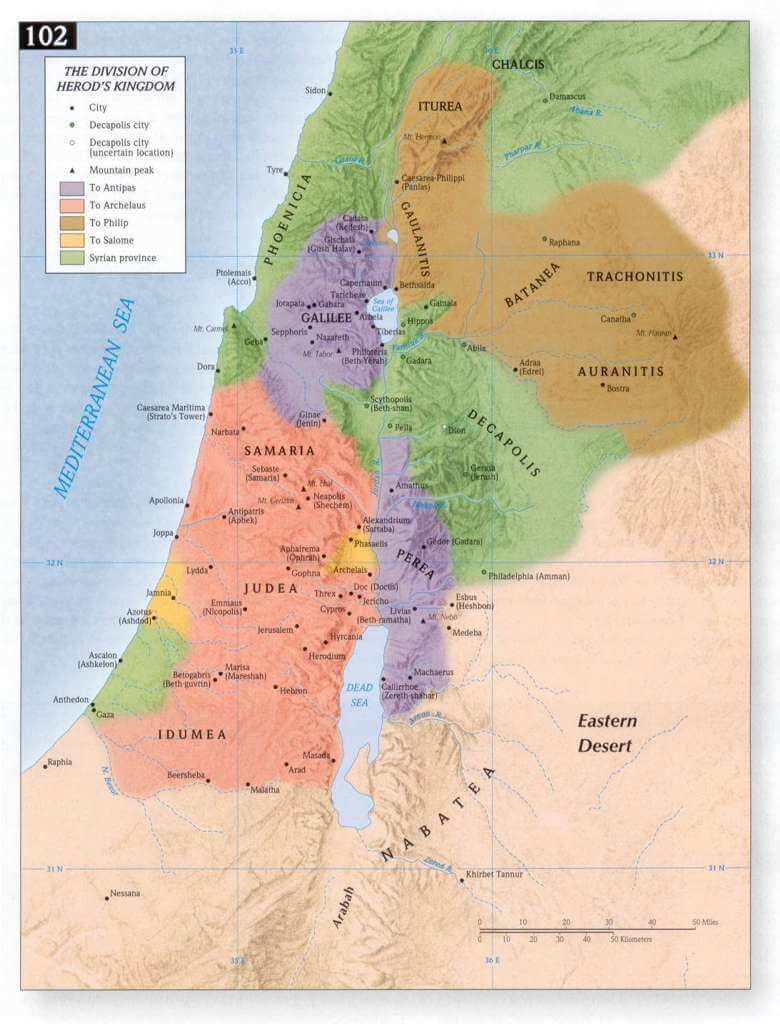 The southern and central parts of Palestine (Judea and Samaria) were given to Herod Archelaus, a man as cruel as his father but without his father’s ability (Matthew 2:22). The northern part of Palestine (Galilee) and part of the area east of Jordan (Perea) were given to Herod Antipas, the man who later killed John the Baptist and who agreed to the killing of Jesus ( Mark 6:14-29; Luke 3:1; Luke 23:6-12). The regions to the north and east of Lake Galilee (Iturea and Trachonitis) were given to Philip, a man of more moderate nature than the rest of his family ( Luke 3:1). This man was half-brother to another Philip (mentioned in Mark 6:17).