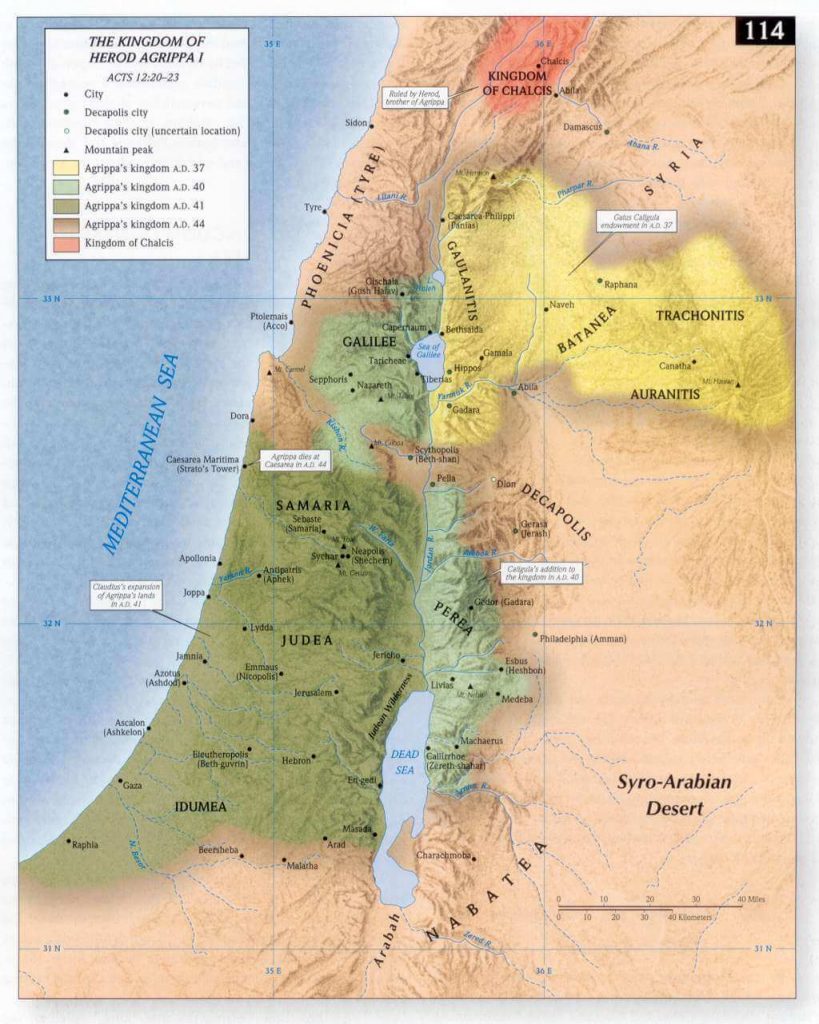 Herod Agrippa I was the son of Aristobulus and Berenice, and grandson of Herod the Great. He was brought up at Rome, and was thrown into prison by Tiberius, where he remained till the accession of Caligula, who made him king, first of the tetrarchy of Philip and Lysanias; afterward the dominions of Antipas were added, and finally Judea and Samaria. Unlike his predecessors, Agrippa was a strict observer of the law, and he sought, with success, the favor of the Jews. It is probable that it was with this view, he put to death James the son of Zebedee, and further imprisoned Peter. Acts 12:1 ff. But his sudden death interrupted his ambitious projects. Acts 12:21; Acts 12:23.