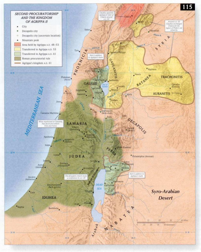 Herod Agrippa II was son of Herod Agrippa I, received territories in the far north of Palestine, where he served Rome loyally from AD 48 to the destruction of the Jewish state in AD 70. He was an expert on Jewish affairs and bore the ceremonial title of king, but he had no authority over the Jews of Judea ( Acts 25:13; Acts 26:3; Acts 26:27; Acts 26:31). His sisters were Bernice and Drusilla ( Acts 24:24; Acts 25:13).