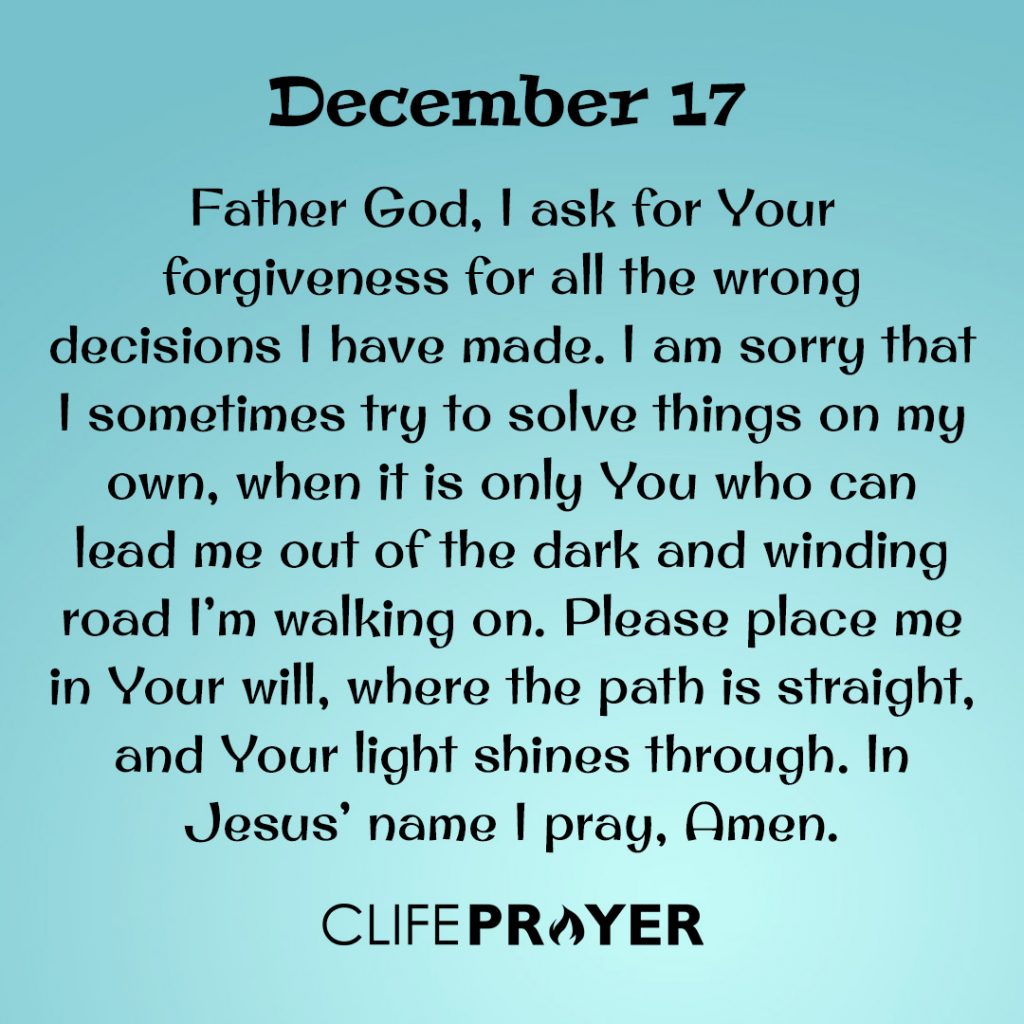 Father God, I ask for Your forgiveness for all the wrong decisions I have made. I am sorry that I sometimes try to solve things on my own, when it is only You who can lead me out of the dark and winding road I’m walking on. Please place me in Your will, where the path is straight, and Your light shines through. In Jesus’ name I pray, Amen.