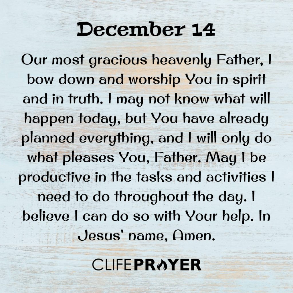 Our most gracious heavenly Father, I bow down and worship You in spirit and in truth. I may not know what will happen today, but You have already planned everything, and I will only do what pleases You, Father. May I be productive in the tasks and activities I need to do throughout the day. I believe I can do so with Your help. In Jesus’ name, Amen.