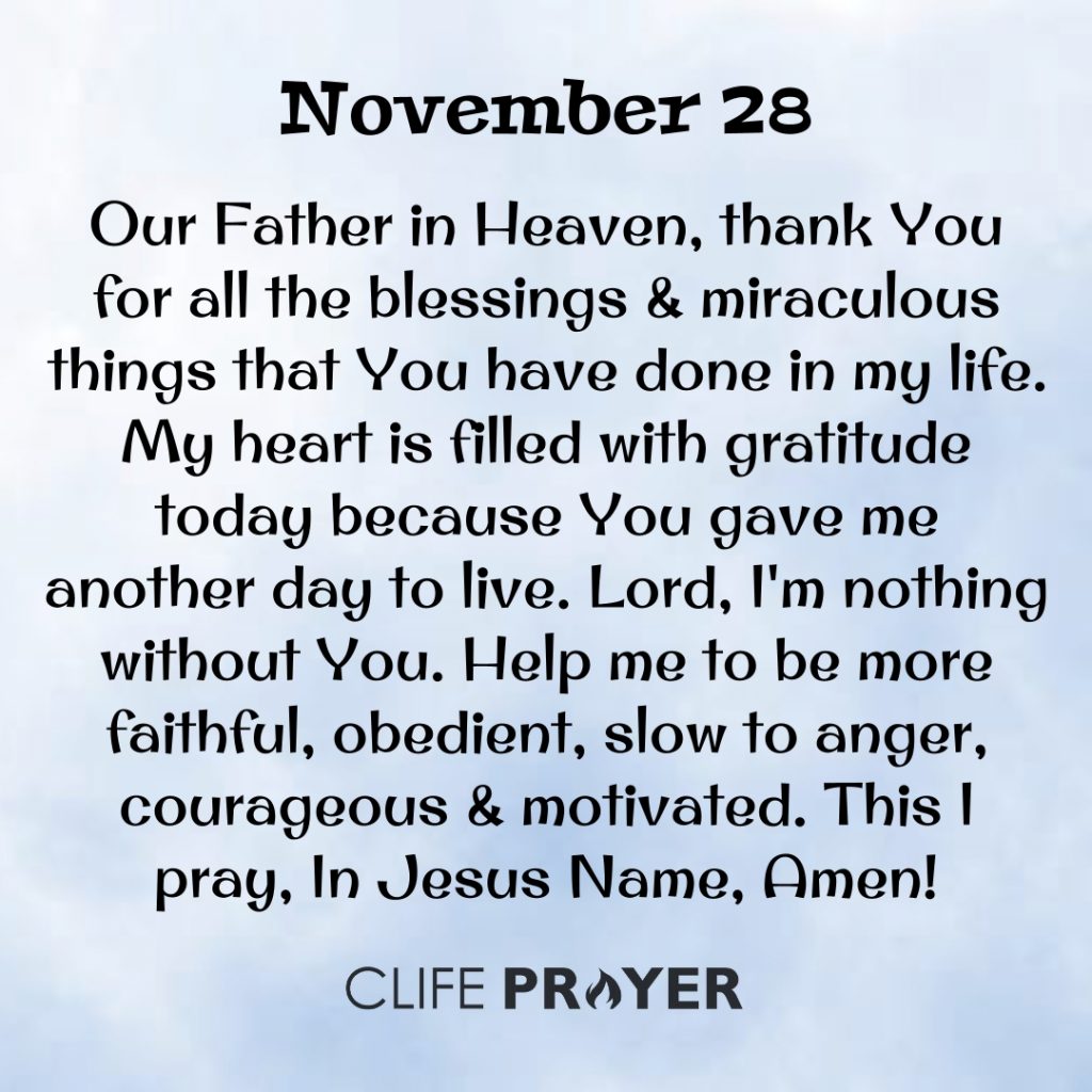 Our Father in Heaven, thank You for all the blessings & miraculous things that You have done in my life. My heart is filled with gratitude today because You gave me another day to live. Lord, I’m nothing without You. Help me to be more faithful, obedient, slow to anger, courageous & motivated. This I pray, In Jesus Name, Amen!