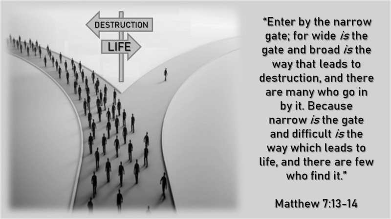 Enter by the narrow gate; for the gate is wide, and the way is broad that leads to destruction, and many are those who enter by it. For the gate is small, and the way is narrow that leads to life, and few are those who find it. (Matthew 7:13–14)