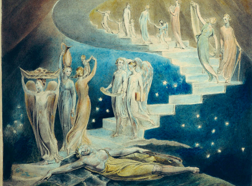 To comfort him, God gives him a dream in which he sees a ladder connecting heaven and earth, reminding him of the promised blessings given to him through his father, similar to that which Abraham had received.