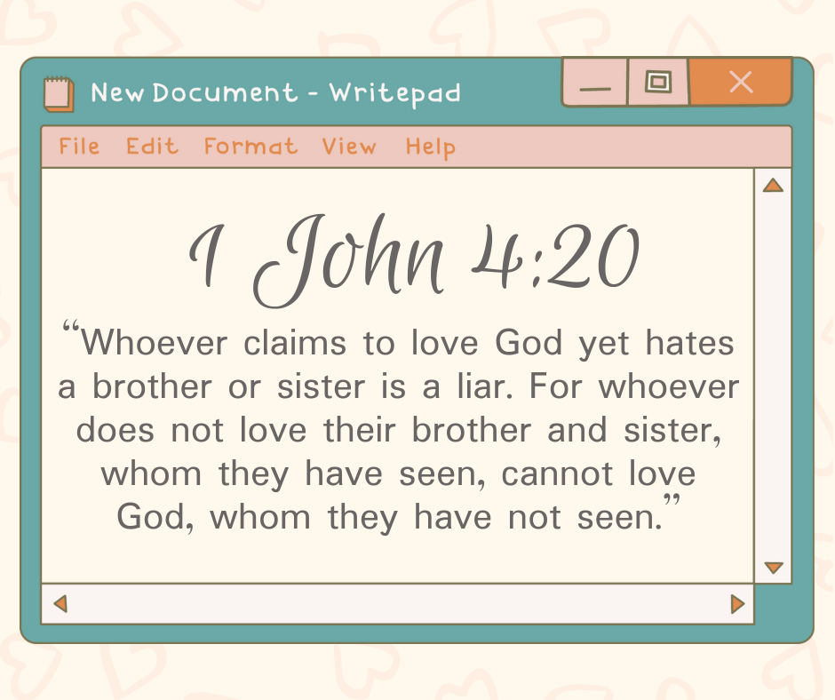 “Whoever claims to love God yet hates a brother or sister is a liar. For whoever does not love their brother and sister, whom they have seen, cannot love God, whom they have not seen.” – 1 John 4:20