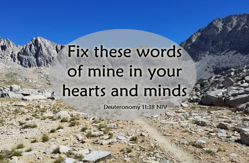 Fix these words of mine in your hearts and minds; tie them as symbols on your hands and bind them on your foreheads. Teach them to your children, talking about them when you sit at home and when you walk along the road, when you lie down and when you get up. Deuteronomy 11:18-19 NIV