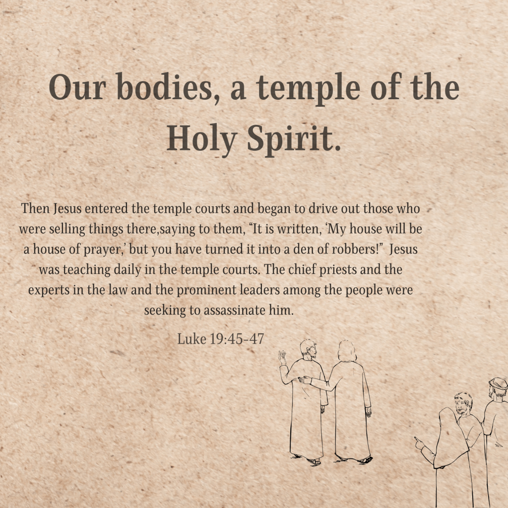 In today’s reflection for the Holy week, we remember Jesus Christ, cleansing the temple, and now the temple is us. The spirit of the Lord dwells in us, we God’s people, the church, who will worship the Lord in spirit and in truth, no longer in venues, sites and hills (John 4:23-24) for through Christ, we are baptized with the Holy Spirit, therefore He now lives in us, God with us. In verse 24, we see the attempts against Christ as he teaches in the temple, same goes with us, as the living temples, the enemy attempts everyday to draw us away from the sanctification of the Lord. May we be more aware of this and in times of doubts, confusion and temptation, may we even hold tighter to Christ.