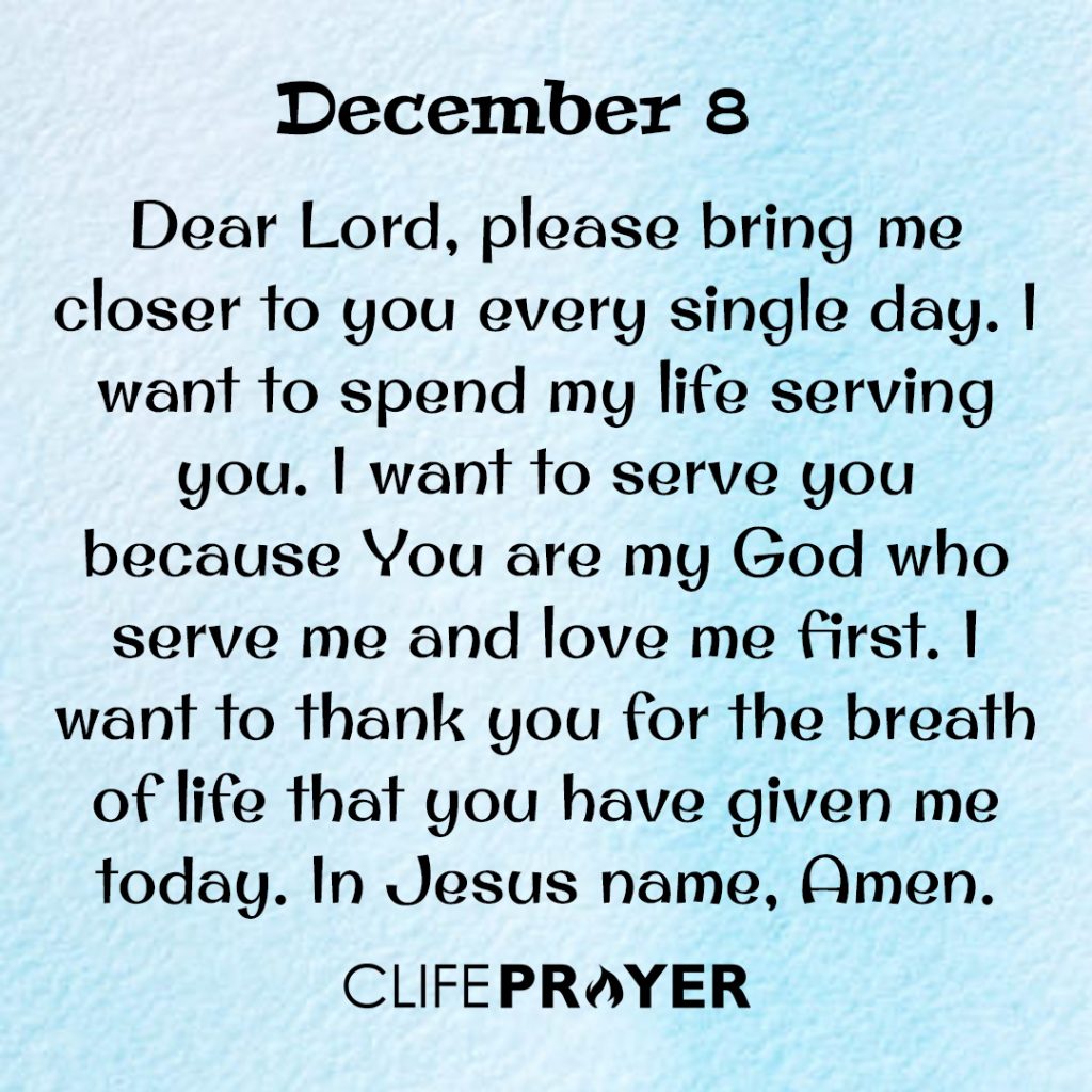Dear Lord, please bring me closer to you every single day. I want to spend my life serving you. I want to serve you because You are my God who serves me and loves me first. I want to thank you for the breath of life that you have given me today. In Jesus name, Amen.
