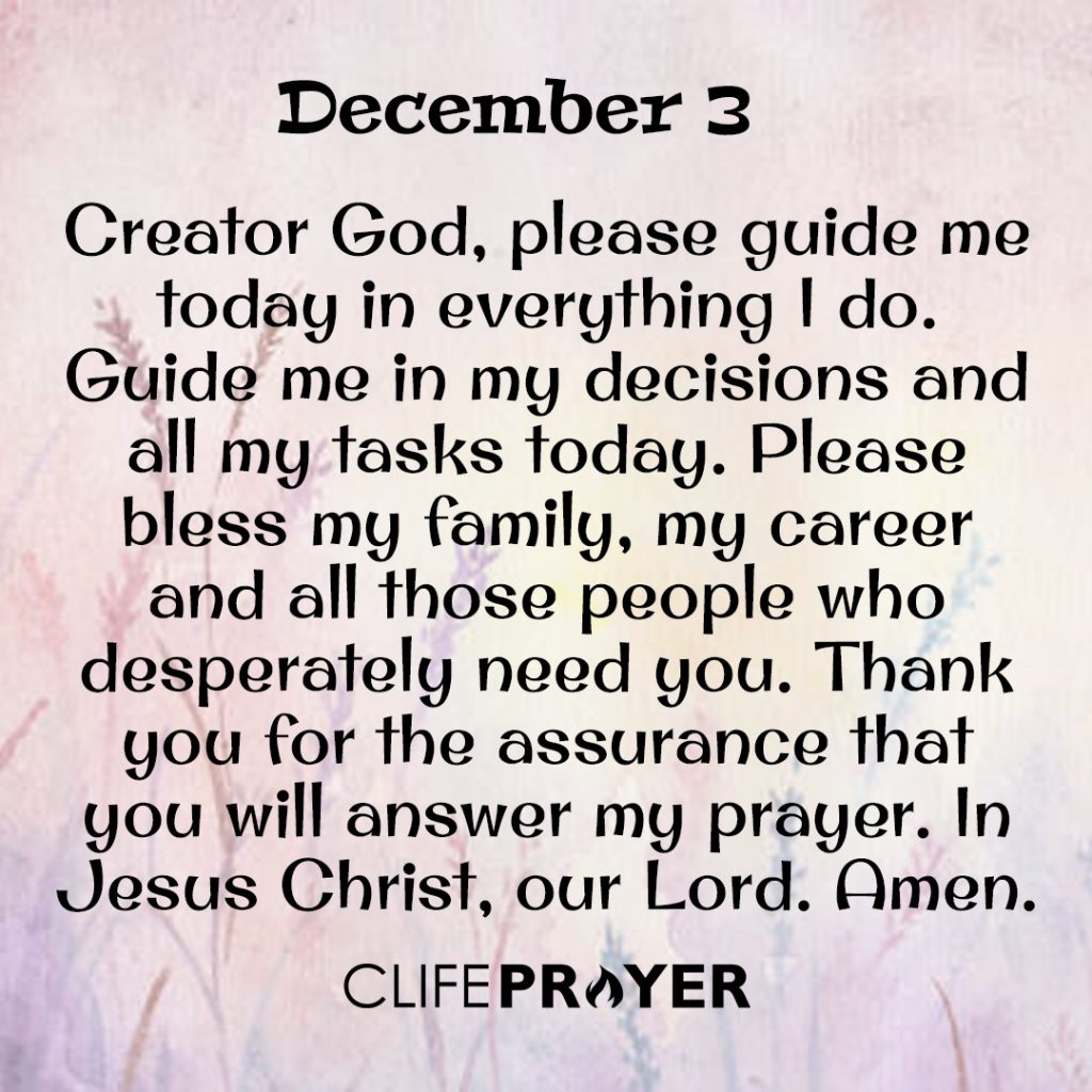 Creator God, please guide me today in everything I do. Guide me in my decisions and all my tasks today. Please bless my family, my career and all those people who desperately need you. Thank you for the assurance that you will answer my prayer. In Jesus Christ, our Lord. Amen.