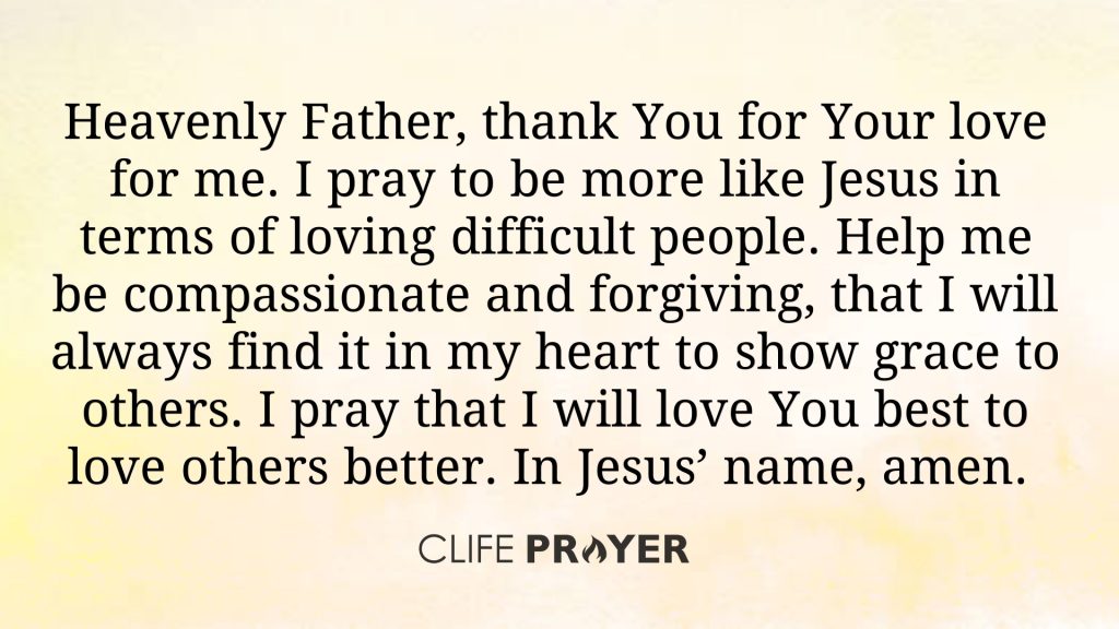 Heavenly Father, thank You for Your love for me. I pray to be more like Jesus in terms of loving difficult people. Help me be compassionate and forgiving, that I will always find it in my heart to show grace to others. I pray that I will love You best to love others better. In Jesus’ name, amen.