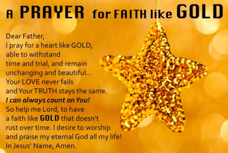 Dear Father, I pray for a heart like gold, able to withstand time and trial, and remain unchanging and beautiful… Your love never fails and Your truth stays the same. I can always count on You! So help me Lord, to have a faith like gold that doesn’t rust over time. I desire to worship and praise my eternal God all my life. In Jesus’ name, Amen.