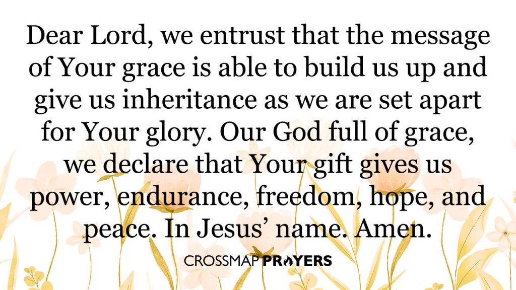 Our Father, full of grace and author of peace, we praise You for whatever we are now, we are certain that You have poured out Your special favor on us. We entrust that the message of Your grace is able to build us up and give us inheritance as we are set apart for Your glory. Gracious Lord, we declare that Your gift gives us power, endurance, freedom, hope, and peace.