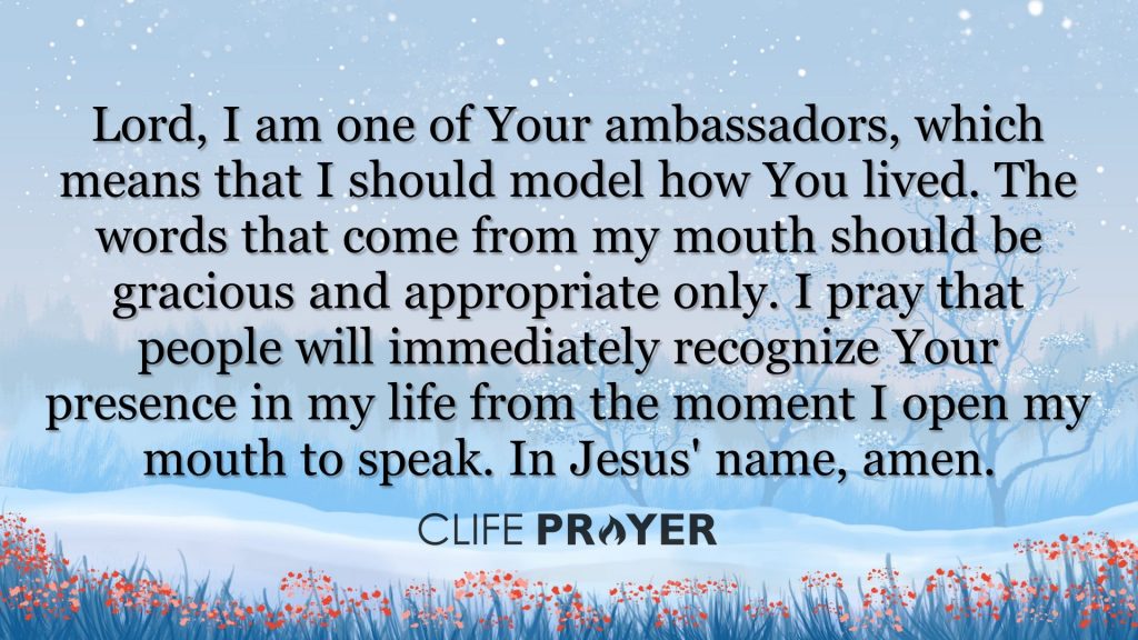 I am one of Your ambassadors, which means that I should model how You lived. The words that come from my mouth should be gracious and appropriate only. I pray that people will immediately recognize Your presence in my life from the moment I open my mouth to speak. Lord, I come before You because I want to glorify You with everything I do, especially with my words.