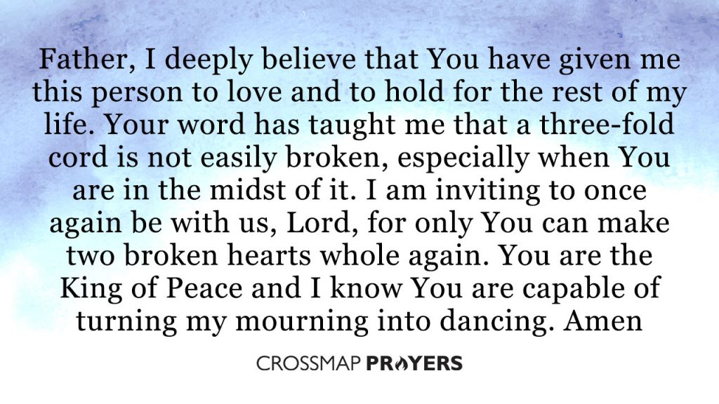 Father, I deeply believe that You have given me this person to love and to hold for the rest of my life. Your word has taught me that a three-fold cord is not easily broken, especially when You are in the midst of it. I am inviting to once again be with us, Lord, for only You can make two broken hearts whole again. You are the King of Peace and I know You are capable of turning my mourning into dancing. I know it is Your will that we should lead a loving and peaceful life with one another. Hear me, dear God, and bring the two of us to a relationship that You have restored.