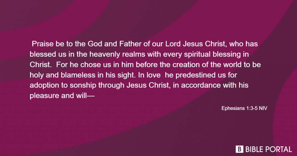 Ephesians 1:3-5 All praise to God, the Father of our Lord Jesus Christ, who has blessed us with every spiritual blessing in the heavenly realms because we are united with Christ. Even before he made the world, God loved us and chose us in Christ to be holy and without fault in his eyes. God decided in advance to adopt us into his own family by bringing us to himself through Jesus Christ. This is what he wanted to do, and it gave him great pleasure.