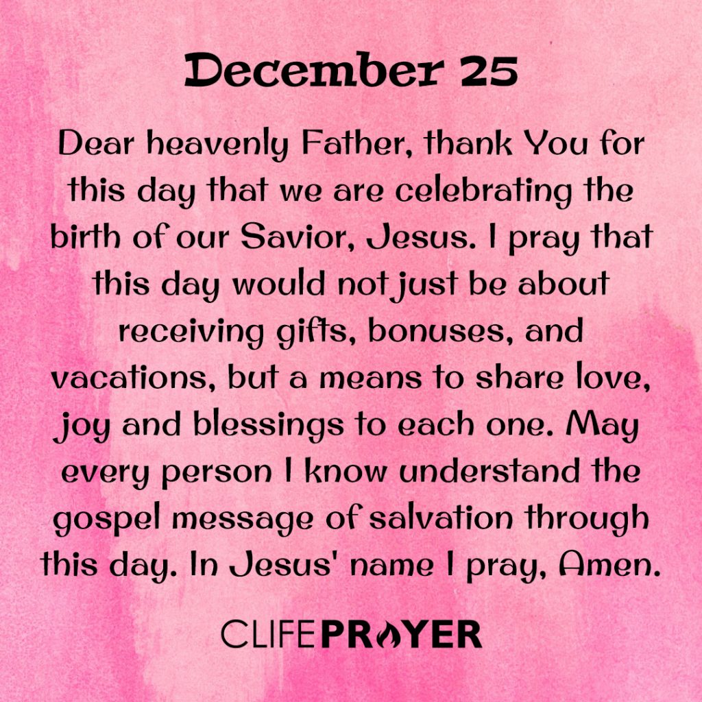 Dear heavenly Father, thank You for this day that we are celebrating the birth of our Savior, Jesus. I pray that this day would not just be about receiving gifts, bonuses, and vacations, but a means to share love, joy and blessings to each one. May every person I know understand the gospel message of salvation through this day. In Jesus’ name I pray, Amen.