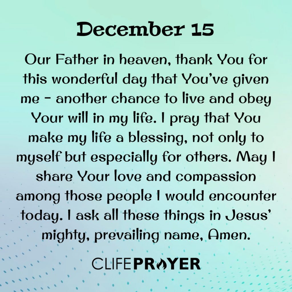 Our Father in heaven, thank You for this wonderful day that You’ve given me – another chance to live and obey Your will in my life. I pray that You make my life a blessing, not only to myself but especially for others. May I share Your love and compassion among those people I would encounter today. I ask all these things in Jesus’ mighty, prevailing name, Amen.