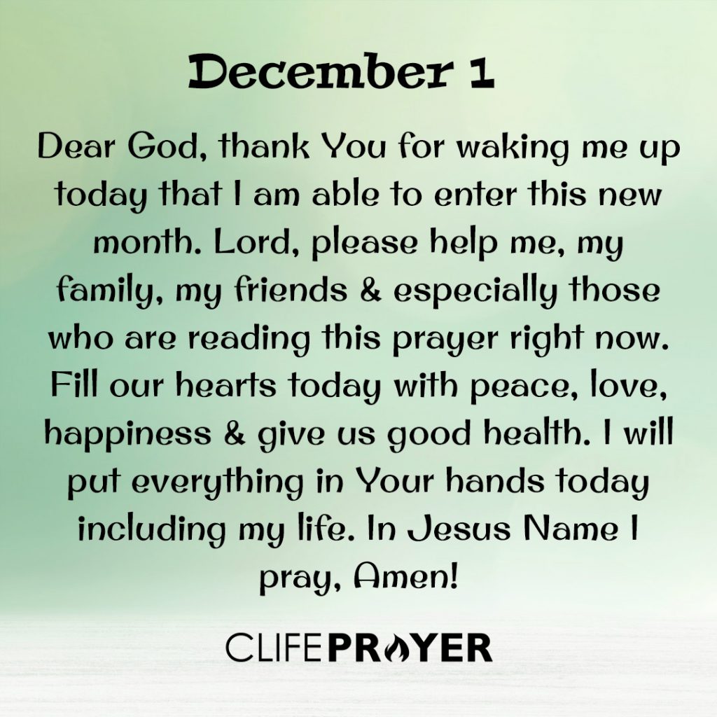 Dear God, thank You for waking me up today that I am able to enter this new month. Lord, please help me, my family, my friends & especially those who are reading this prayer right now. Fill our hearts today with peace, love, happiness & give us good health. I will put everything in Your hands today including my life. In Jesus Name I pray, Amen!