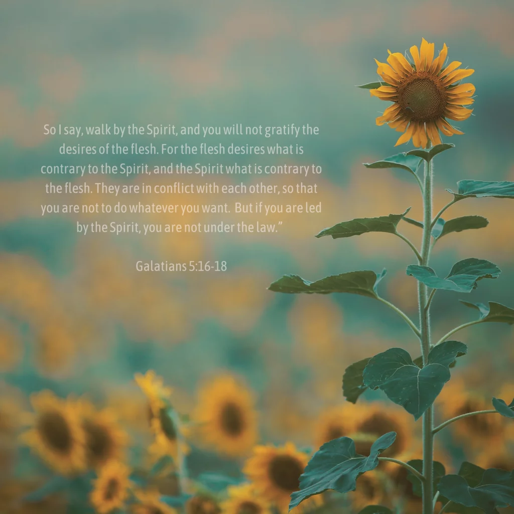 “So I say, walk by the Spirit, and you will not gratify the desires of the flesh. For the flesh desires what is contrary to the Spirit, and the Spirit what is contrary to the flesh. They are in conflict with each other, so that you are not to do whatever you want. But if you are led by the Spirit, you are not under the law.” Galatians 5:16-18