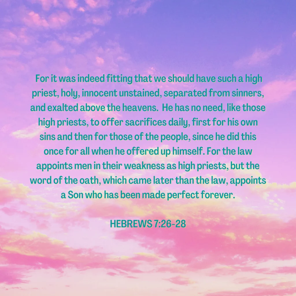 “For it was indeed fitting that we should have such a high priest, holy, innocent unstained, separated from sinners, and exalted above the heavens. He has no need, like those high priests, to offer sacrifices daily, first for his own sins and then for those of the people, since he did this once for all when he offered up himself. For the law appoints men in their weakness as high priests, but the word of the oath, which came later than the law, appoints a Son who has been made perfect forever.“ Hebrews 7:26-28