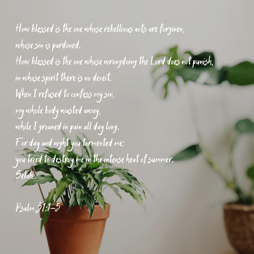 How blessed is the one whose rebellious acts are forgiven,whose sin is pardoned.How blessed is the one whose wrongdoing the Lord does not punish,in whose spirit there is no deceit.When I refused to confess my sin,my whole body wasted away,while I groaned in pain all day long.For day and night you tormented me;you tried to destroy me in the intense heat[ of summer. Selah