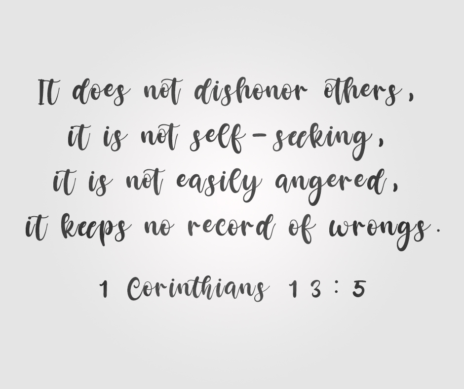 “It does not dishonor others, it is not self-seeking, it is not easily angered, it keeps no record of wrongs.” – 1 Corinthians 13:5
