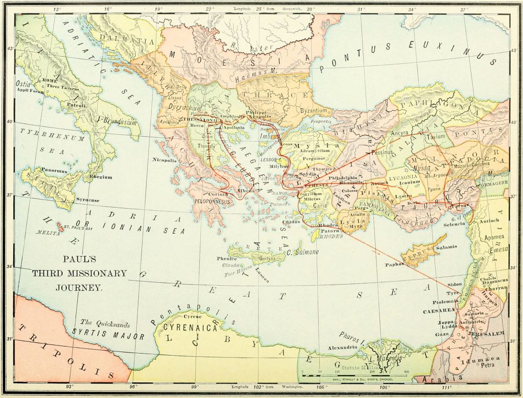 After Pentecost A.D. 57, when Paul left Ephesus for Troas. Having stayed for a time at Troas preaching with success ( 2 Corinthians 2:12-13), he went on to Macedonia to meet Titus there, since he was disappointed in not finding him at Troas as he had expected. In Macedonia he heard from him the comforting intelligence of the good effect of the first epistle upon the Corinthians, and having experienced the liberality of the Macedonian churches (2 Corinthians 8) he wrote this second epistle and then went on to Greece, where he stayed three months; then he reached Philippi by land about Passover or Easter, A.D. 58 ( Acts 20:1-6). So that the autumn of A.D. 57 will be the date of 2 Corinthians. Place of writing. Macedonia, as 2 Corinthians 9:2 proves. In “ASIA” (see) he had been in great peril ( 2 Corinthians 1:8-9), whether from the tumult at Ephesus ( Acts 19:23-41) or a dangerous illness (Alford).