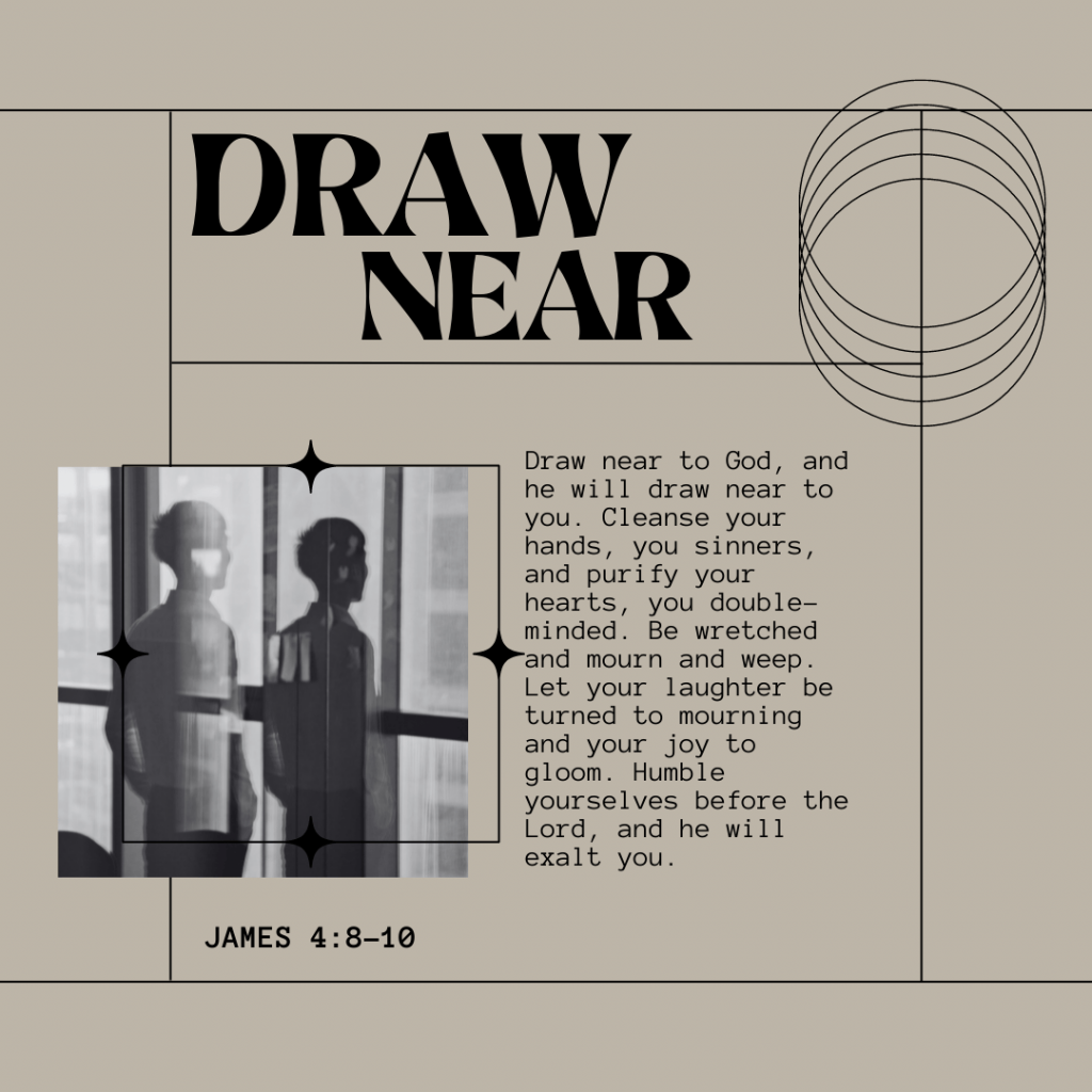 Draw near to God, and he will draw near to you. Cleanse your hands, you sinners, and purify your hearts, you double-minded. Be wretched and mourn and weep. Let your laughter be turned to mourning and your joy to gloom. Humble yourselves before the Lord, and he will exalt you. James 4:8-10