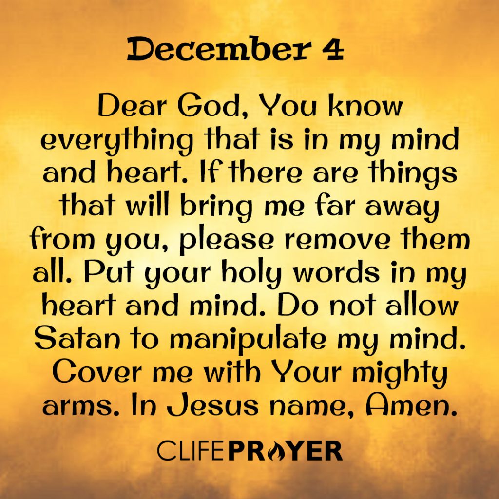 Dear God, You know everything that is in my mind and heart. If there are things that will bring me far away from you, please remove them all. Put your holy words in my heart and mind. Do not allow Satan to manipulate my mind. Cover me with Your mighty arms. In Jesus name, Amen.