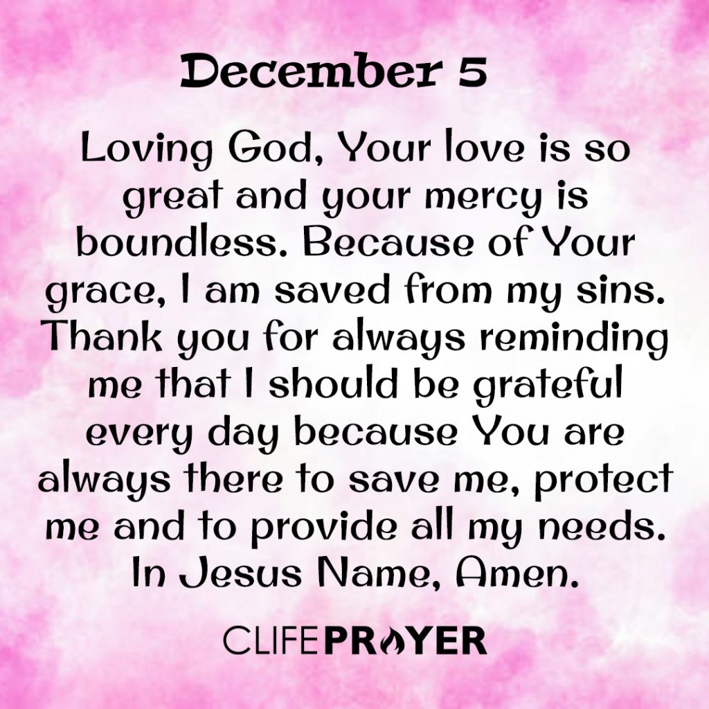 Loving God, Your love is so great and your mercy is boundless. Because of Your grace, I am saved from my sins. Thank you for always reminding me that I should be grateful every day because You are always there to save me, protect me and to provide all my needs. In Jesus Name, Amen.