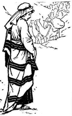 Then Jacob went onward in his long journey. He walked across the river Jordan in a shallow place, feeling his way with his staff; he climbed mountains and journeyed beside the great desert on the east, and at last came to the city of Haran. Beside the city was the well, where Abraham’s servant had met Jacob’s mother, Rebekah; and there, after Jacob had waited for a time, he saw a young woman coming with her sheep to give them water.