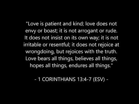 "Love is patient and kind; love does not envy or boast; it is not arrogant or rude. It does not insist on its own way; it is not irritable or resentful; it does not rejoice at wrongdoing, but rejoices with the truth. Love bears all things, believes all things, hopes all things, endures all things." - 1 Corinthians 13:4-7 (ESV)